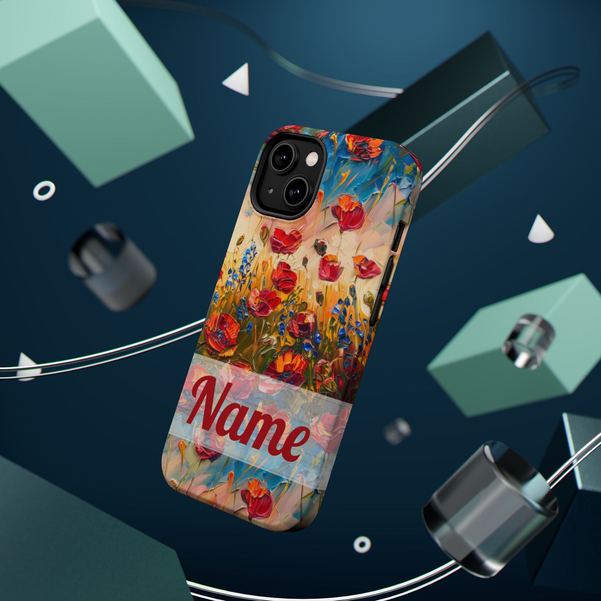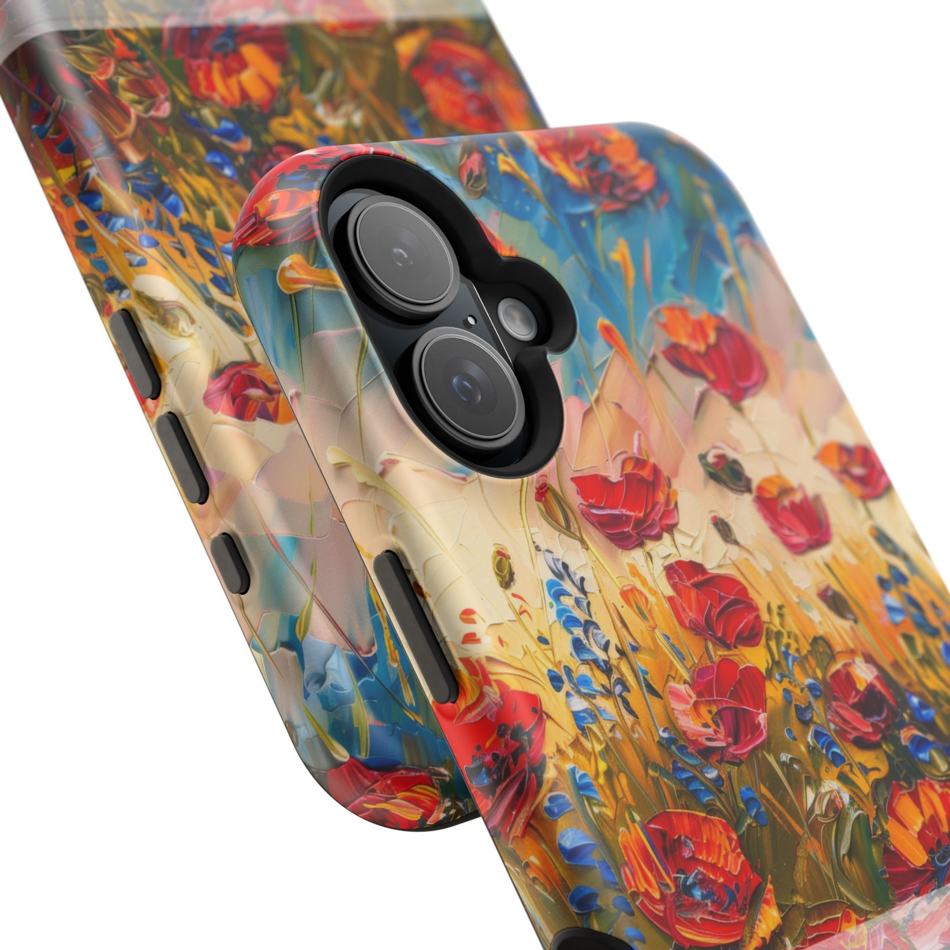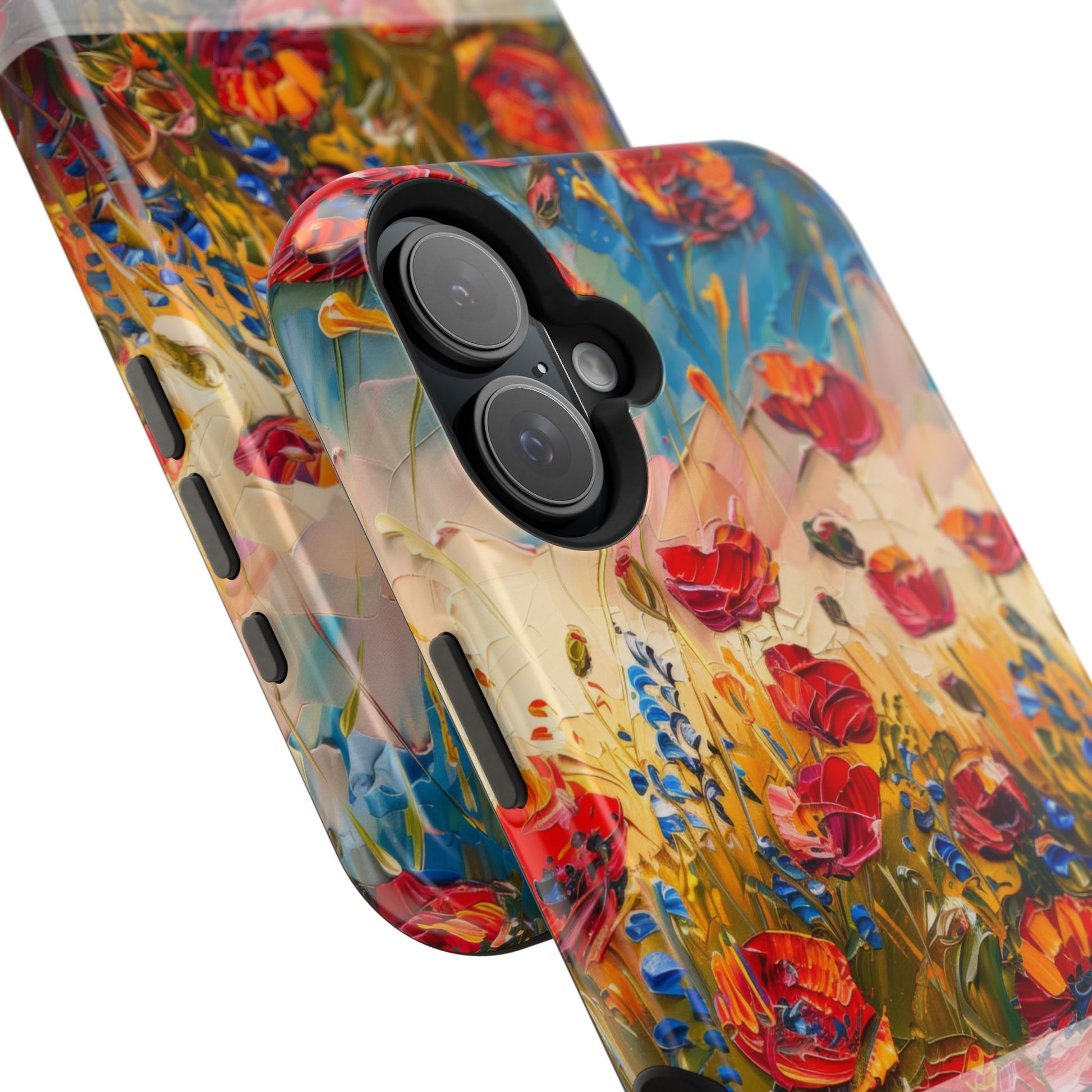 Turn your phone into a masterpiece. This stunning case features red poppies painted in a bold, abstract style, with rich strokes of color and palette knife texture that mimics real oil paint. Set against a soft blue sky and open green field, it’s like carrying a tiny landscape painting in your hand. 🖼️📲